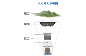 そのため遠近両用では狭い「中間距離の見やすい場所」が広く、パソコンのモニターを見る時などもアゴを上げなくていいので快適ですし、テレビ鑑賞やお買い物など、かけっぱなしの常用メガネとしてお使いいただけます。